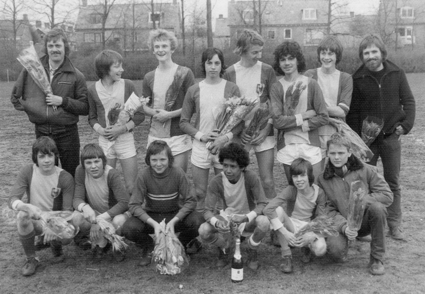 Dennis Nagtzaam, achteraan precies in het midden, als kampioen met Go-Ahead B2 in 1977. De foto is genomen na de gewonnen wedstrijd tegen de CJV’ers op sportcomplex de Zandweerd. Foto: collectie Dennis Nagtzaam.